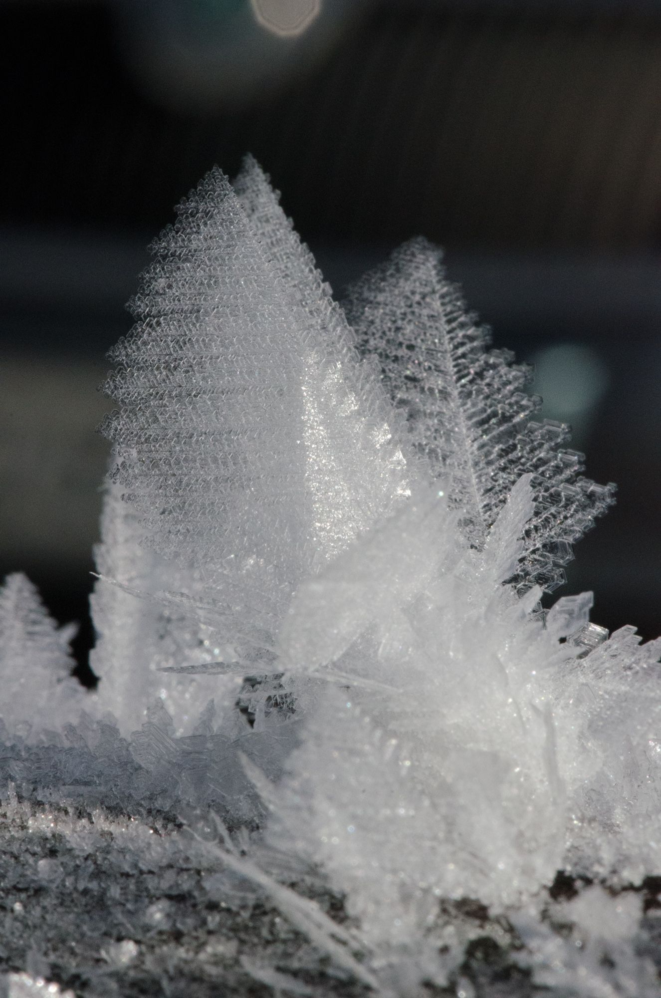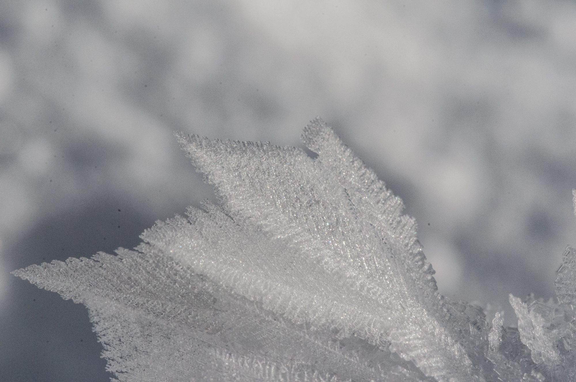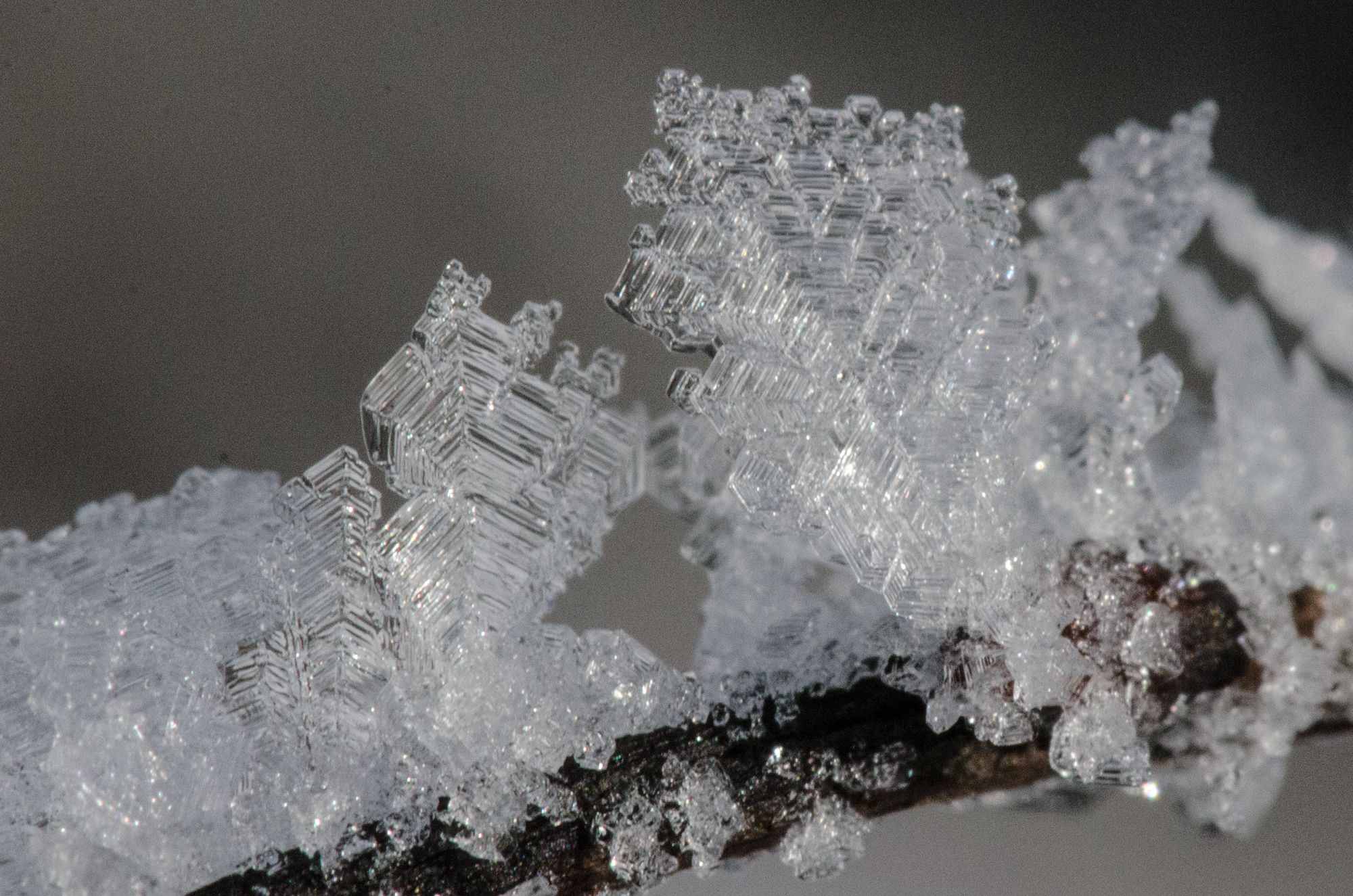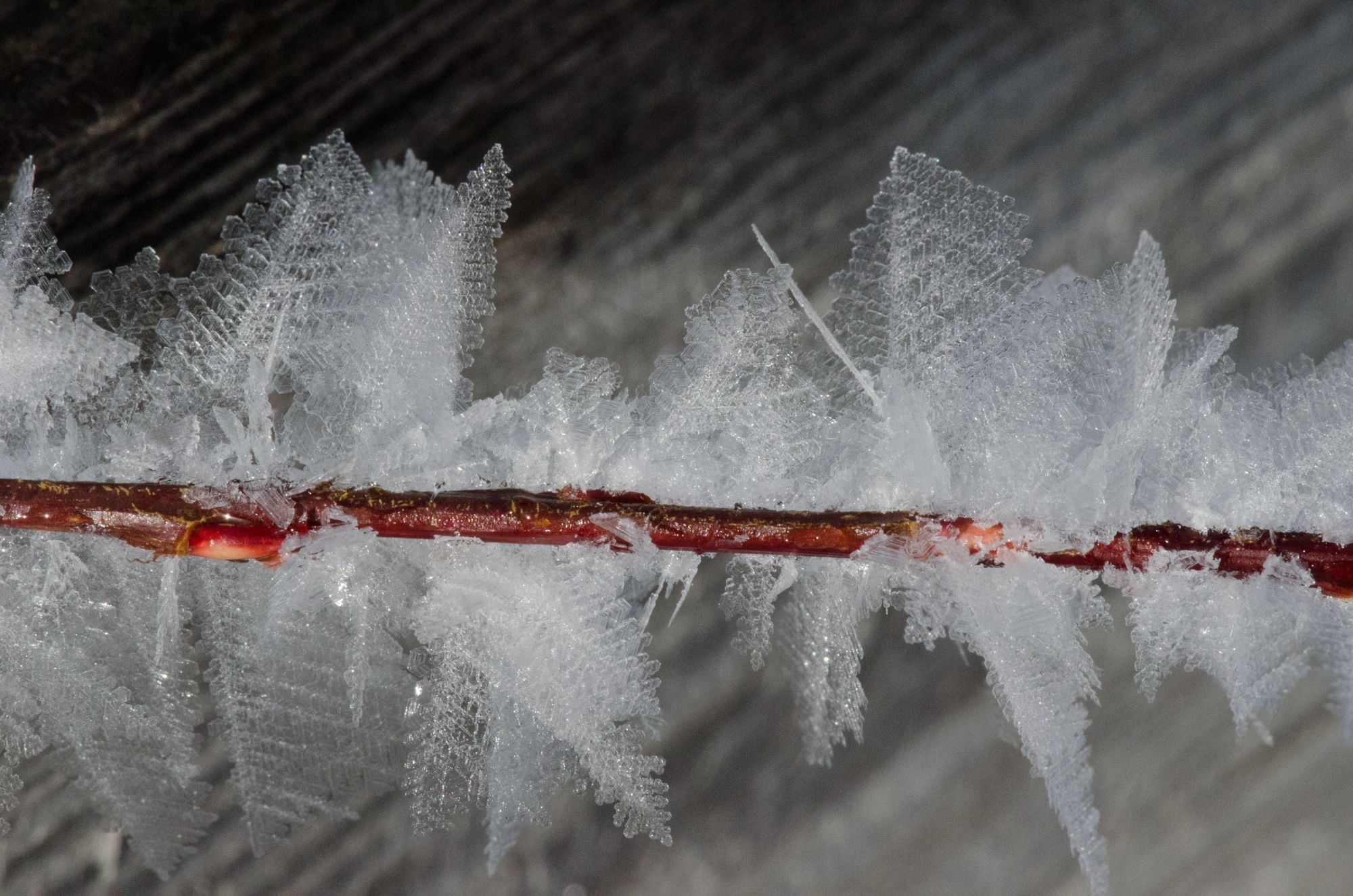Die Temperatur ist über Nacht weit unter den Gefrierpunkt gefallen. Es haben sich großflächig Eiskristalle gebildet. Die größten Eiskristalle, die wir je gesehen habe. Die Eiskristalle weisen filigrane Strukturen auf, die an Federn oder Farn erinnern. Die Kristalle sind am Boden und auf Ästen gewachsen.