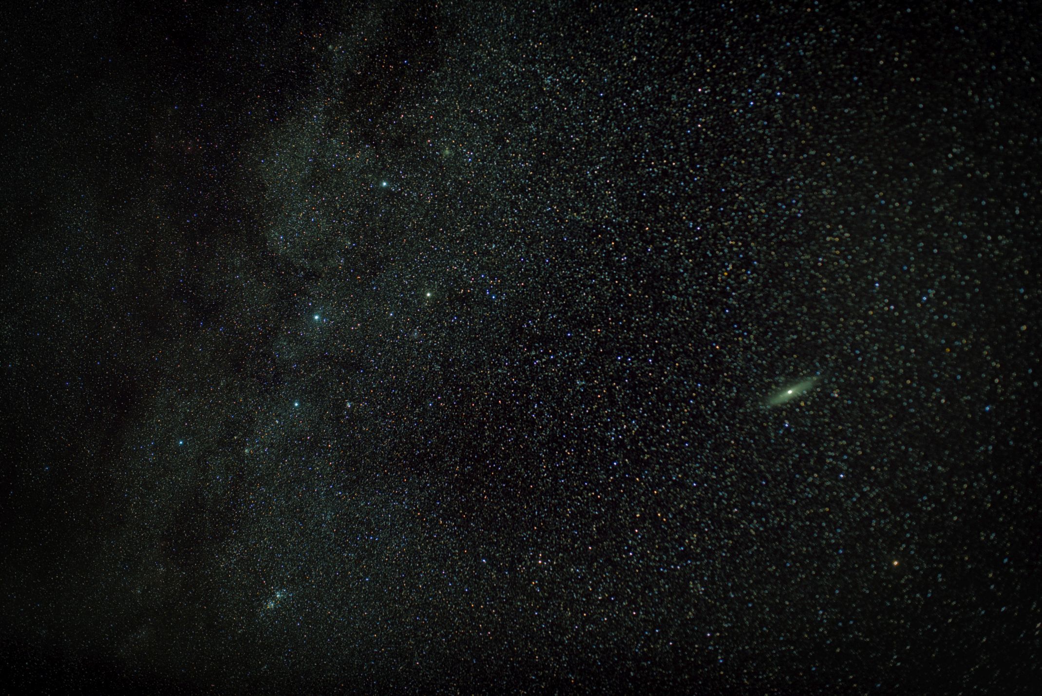 Die Wide-Field-Aufnahme entstand mit einem lichtstarken Objektiv der Brennweite 35 mm bei Blende 2.0 an einer nachgeführten digitialen Spiegelreflexkamera.